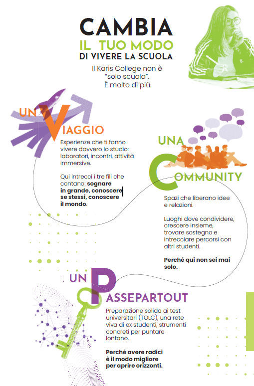 Gli anni della scuola superiore sono decisivi nella formazione dell’identità della persona. Frequentare uno dei tre licei di Karis College significa ricevere una proposta ad ampio raggio che spazia dal rapporto con la tradizione al presente. Karis College è un ponte verso il futuro. Un luogo che valorizza talenti e passioni, offrendo tre indirizzi diversi per crescere, conoscersi e camminare con fiducia verso i propri ideali.