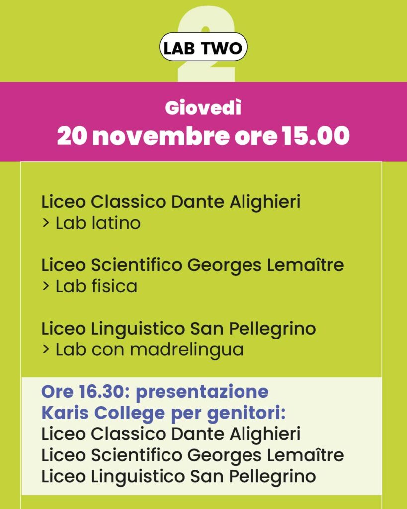 Karis Lab è l’evento formativo organizzato dai licei Karis per aiutarti nell’orientamento sulla scuola superiore.